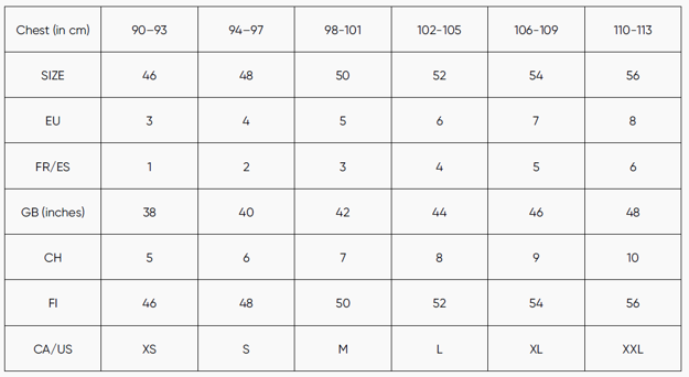 • A számok a mell alatt mért hüvelykeket jelzik
